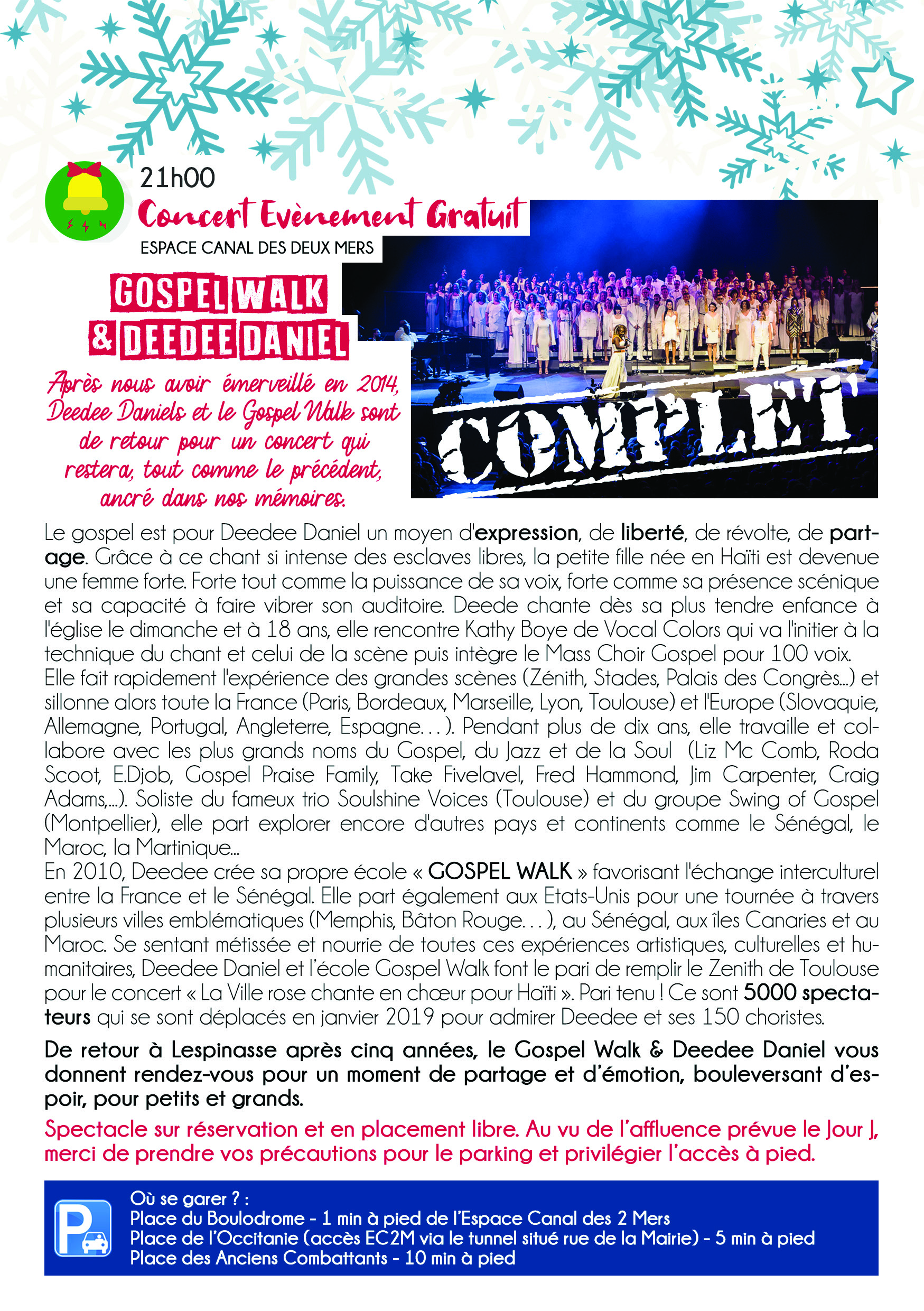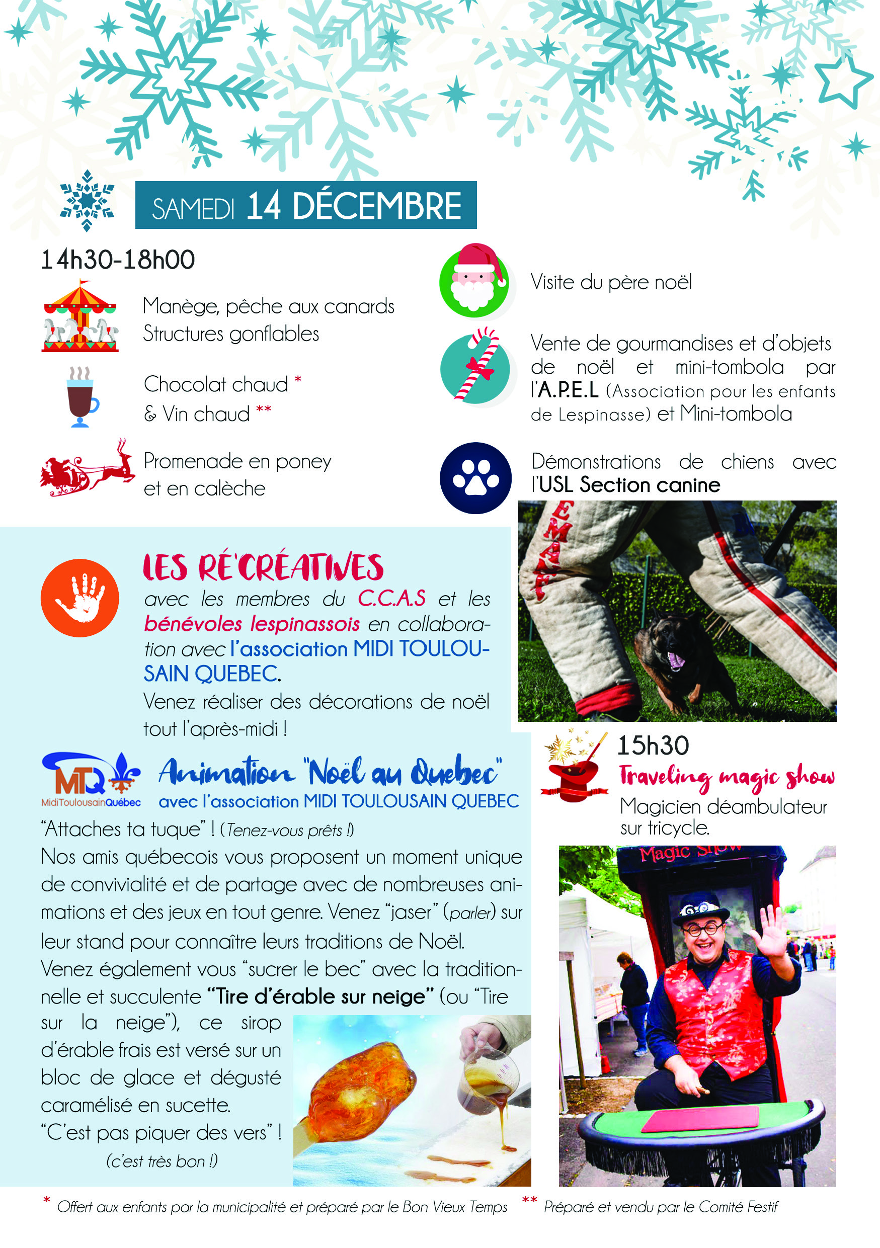 Inaugurées par les illuminations de la ville et par l’arrivée du manège, les festivités de noël se poursuivrontpar des animations diverses tels que la visite du Père Noël, les balades en poney et en calèche, les structures gonflables, les ateliers découvertes, un concert évènement, la parade nocturne, le spectacle-goûter, et quelques nouveautés surprises… À chaque jour son animation !