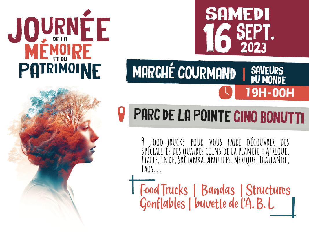 Afin de clôturer cette Grande Journée de la Mémoire et du Patrimone, la Municipalité vous donne rendez-vous le samedi 16 septembre dès 19h au Parc de la Pointe – Gino Bonutti pour la 5ème édition du très attendu Marché Gourmand.